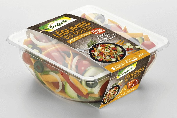 Toujours dans le souci de nous faciliter la vie tout en privilégiant les produits frais, Bonduelle propose des barquettes de légumes prêts à cuisiner. Des mélanges de légumes, aux saveurs du marché, du soleil ou à l’asiatique, accompagnés d’herbes aromatiques qui accompagneront parfaitement vos viandes ou poissons. Prêts en huit minutes à la poêle pour un repas équilibré. Barquette de 350 g au prix de 3,50 €, en GMS.