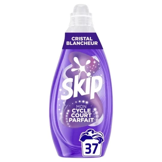 La première lessive spécialement conçue pour les cycles courts. Elle délivre une efficacité optimale, même dès 15 minutes, et un gain de temps, sans compromis sur la propreté de votre linge. Grâce à ses 4 actions, la lessive liquide Skip Cycle Court Cristal Blancheur 37 Lavages ravive le blanc et combat le jaunissement et le grisaillement. 13,49 €, en GMS.